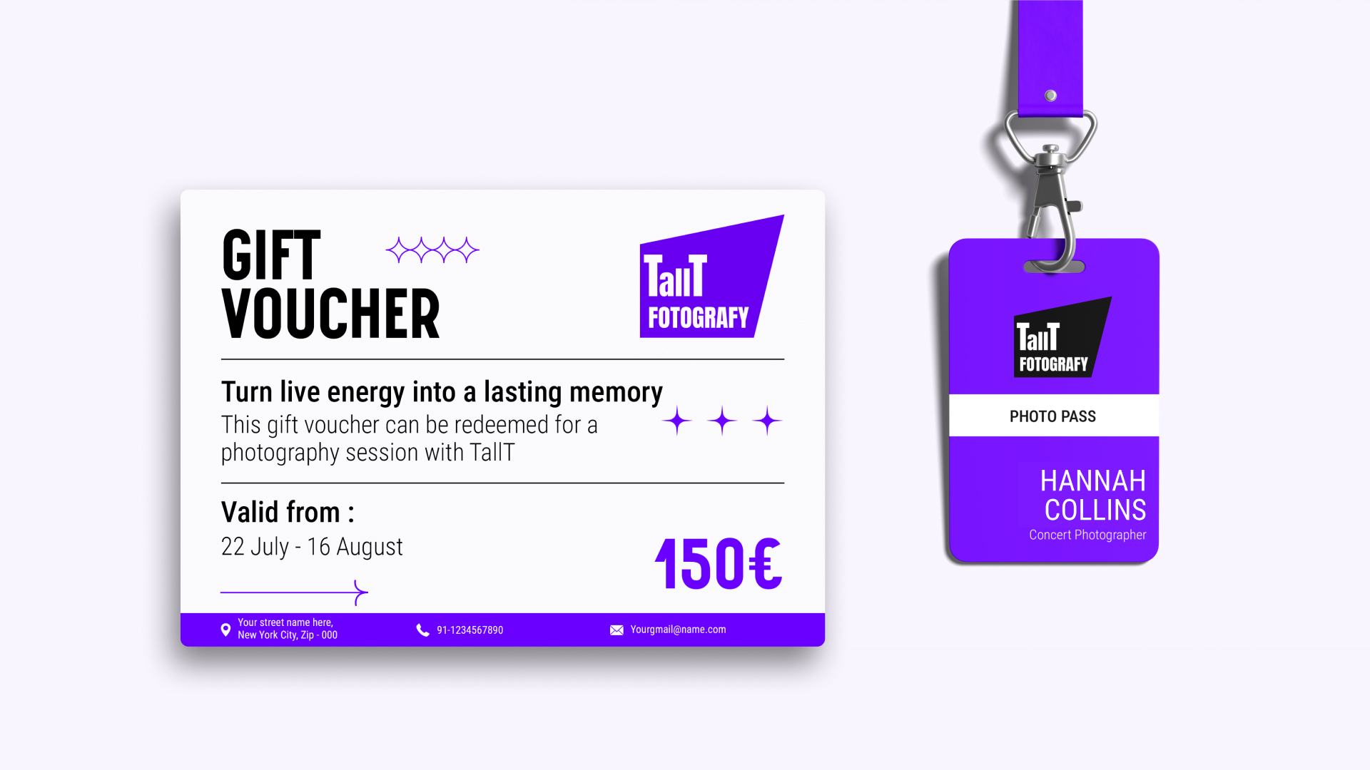 The new identity extends naturally across the photographer’s marketing materials, from concert cards and gift vouchers to social content and promotional visuals. Each asset relies on the strength of the logo and color system, creating a consistent presence that is easy to recognize across different formats.